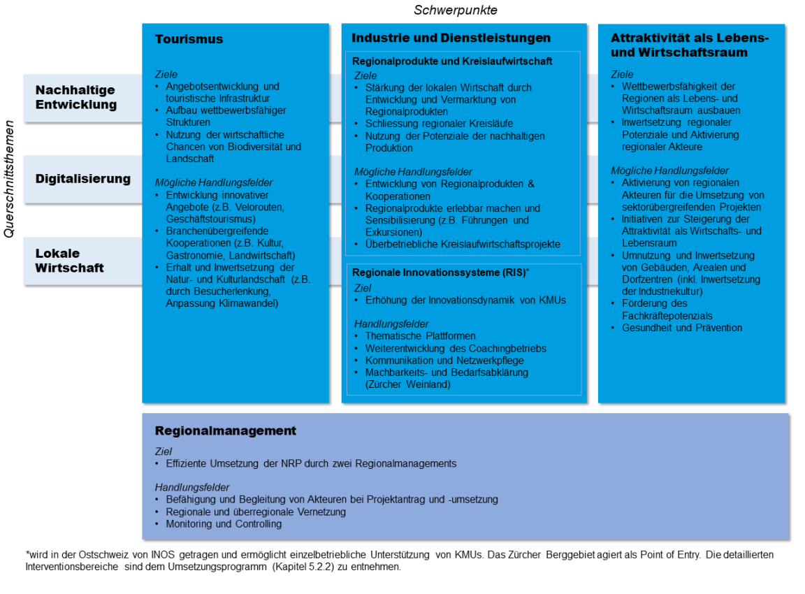 Als Programm der Standortförderung unterstützt die NRP Initiativen, Programme und Projekte, die das Unternehmertum fördern, die Innovationsfähigkeit der KMU sowie die regionale Wertschöpfung steigern und auf diese Weise die Wettbewerbsfähigkeit dieser Räume nachhaltig erhöhen. Damit leistet die NRP einen Beitrag zur Schaffung und Erhaltung von Arbeitsplätzen in den Zielgebieten. Aktuell läuft das vierjährige Umsetzungsprogramm 2024 bis 2027.