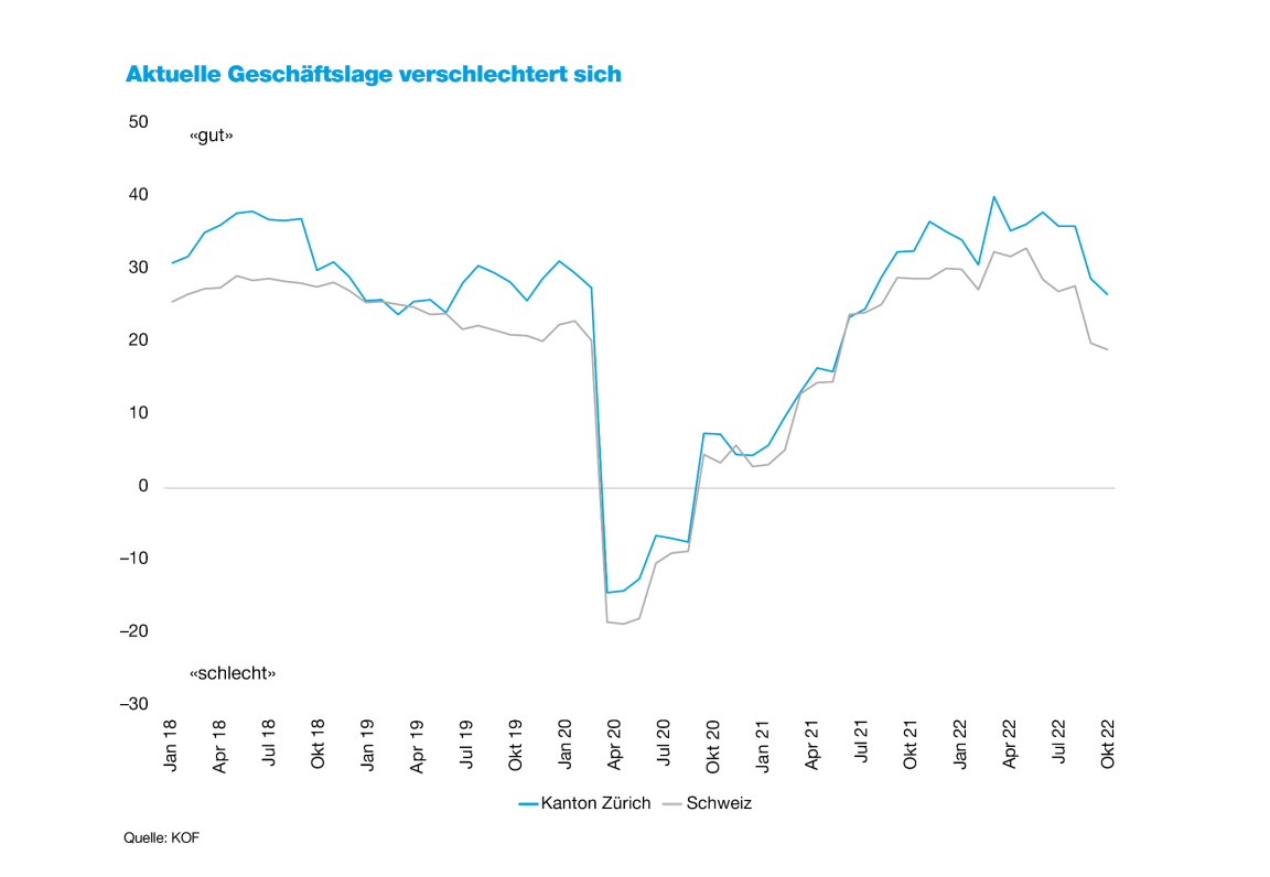 Auch die aktuelle Geschäftslage beurteilen die Unternehmen im Kanton Zürich im August leicht schlechter ein als in den Monaten zuvor. Der Geschäftslageindikator liegt aber nach wie vor auf einem vergleichsweise hohen Niveau und deutlich über dem Wert der Gesamtschweiz.