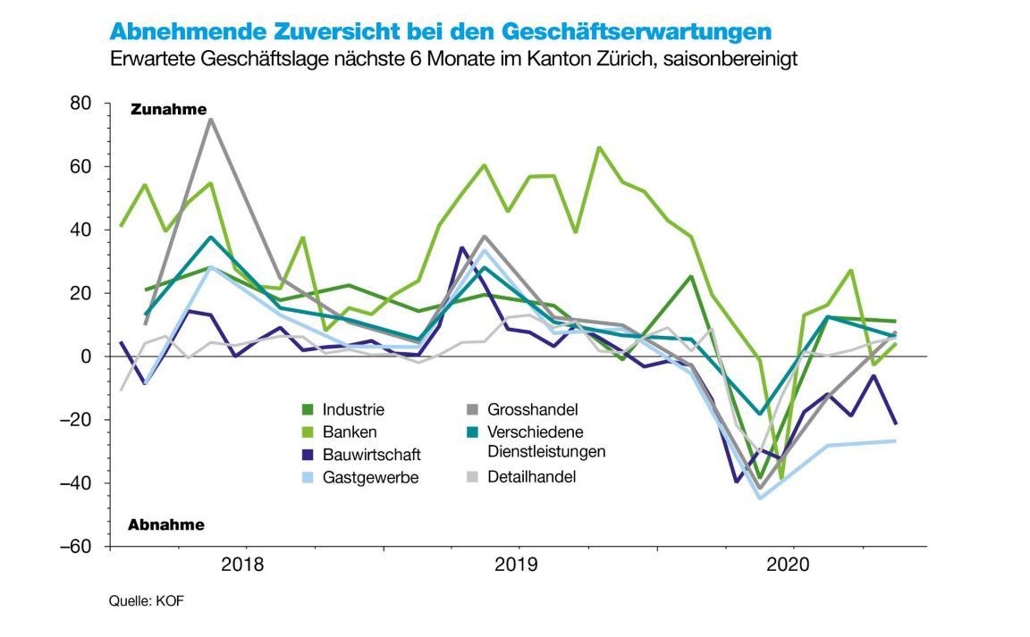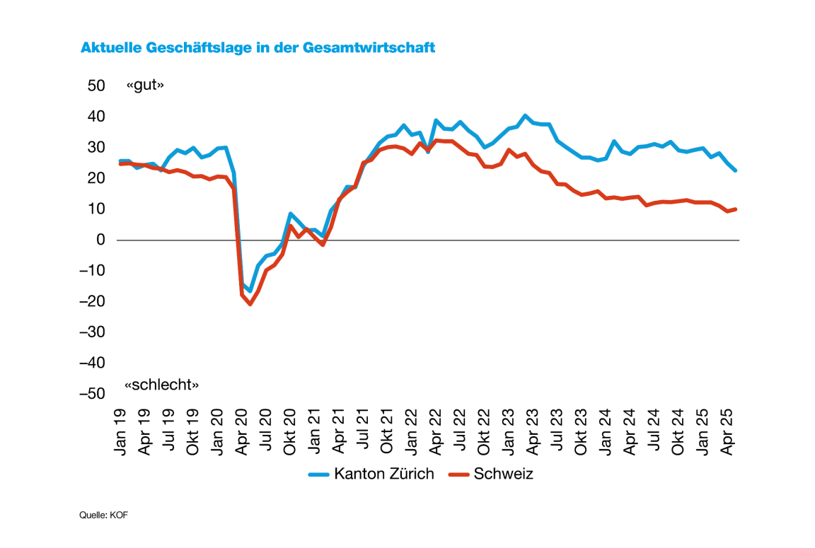 Die seit Anfang August für die Schweiz geltenden US-Exportzölle von 39%, die anhaltende Wirtschaftsschwäche in der EU – insbesondere in Deutschland – sowie die hohe Unsicherheit auf den Weltmärkten dämpfen die Zürcher Konjunkturaussichten in den Sommermonaten. Die Geschäftserwartungen für die nächsten 6 Monat haben sich deutlich eingetrübt. Dennoch gibt es mehr Zürcher Unternehmen, die von einer Verbesserung der Geschäftslage ausgehen, als solche, die mit einer Verschlechterung rechnen.