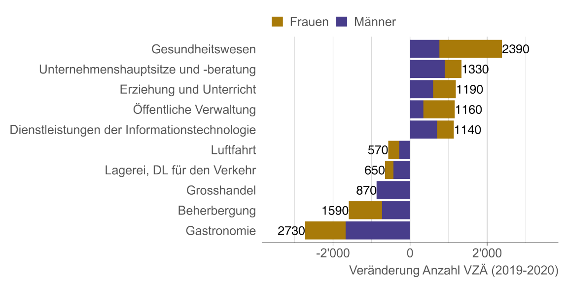 Den wachsenden Branchen stehen solche gegenüber, in denen die Beschäftigung abgenommen hat, beispielsweise Grosshandel (ohne Motorfahrzeughandel) und Hochbau. Bei den Finanzdienstleistern, die zwischen 2012 und 2017 sehr viele Stellen verloren haben, ist die Beschäftigung seither etwa gleichgeblieben. Allerdings schlägt sich die Übernahme der Credit Suisse durch die UBS im Jahr 2023 noch nicht in den derzeitigen Zahlen nieder.