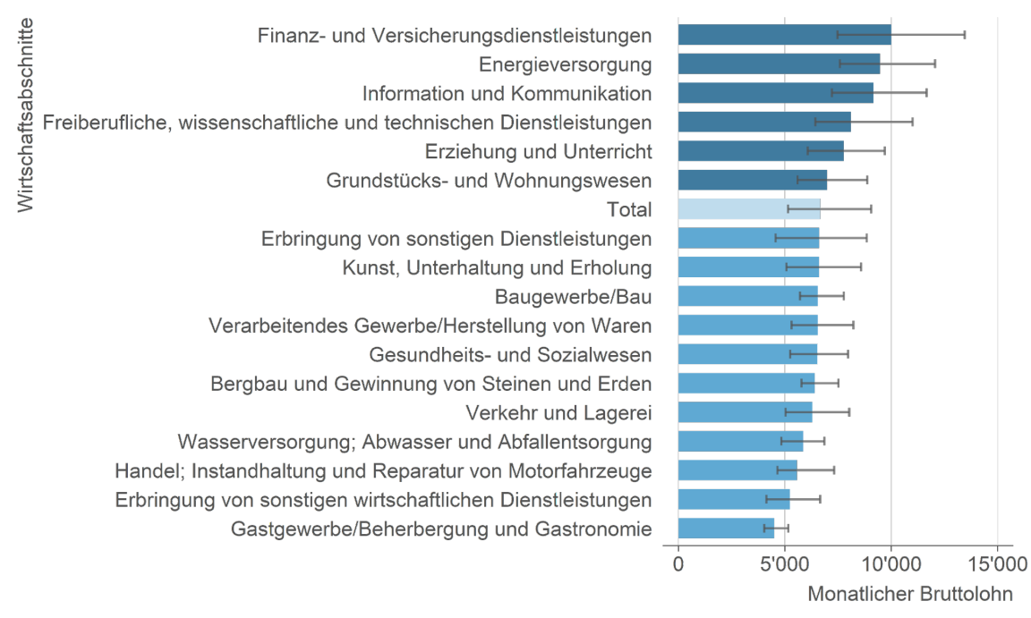 Die höchsten Löhne bezahlen die Finanz- und Versicherungsbranche sowie die Informations- und Kommunikationsbranche, zu der unter anderem der ganze IT-Bereich gehört. Gut bezahlt auch die Branche «Freiberufliche, wissenschaftliche und technische Dienstleistungen», darunter Rechts- und Wirtschaftsberatung sowie Architektur- und Ingenieurleistungen. Ebenfalls ein hohes Lohnniveau kann erwarten, wer im Bereich der Energieversorgung, bei der öffentlichen Hand oder in Erziehung und Unterricht (ohne familienergänzende Betreuung) tätig ist.